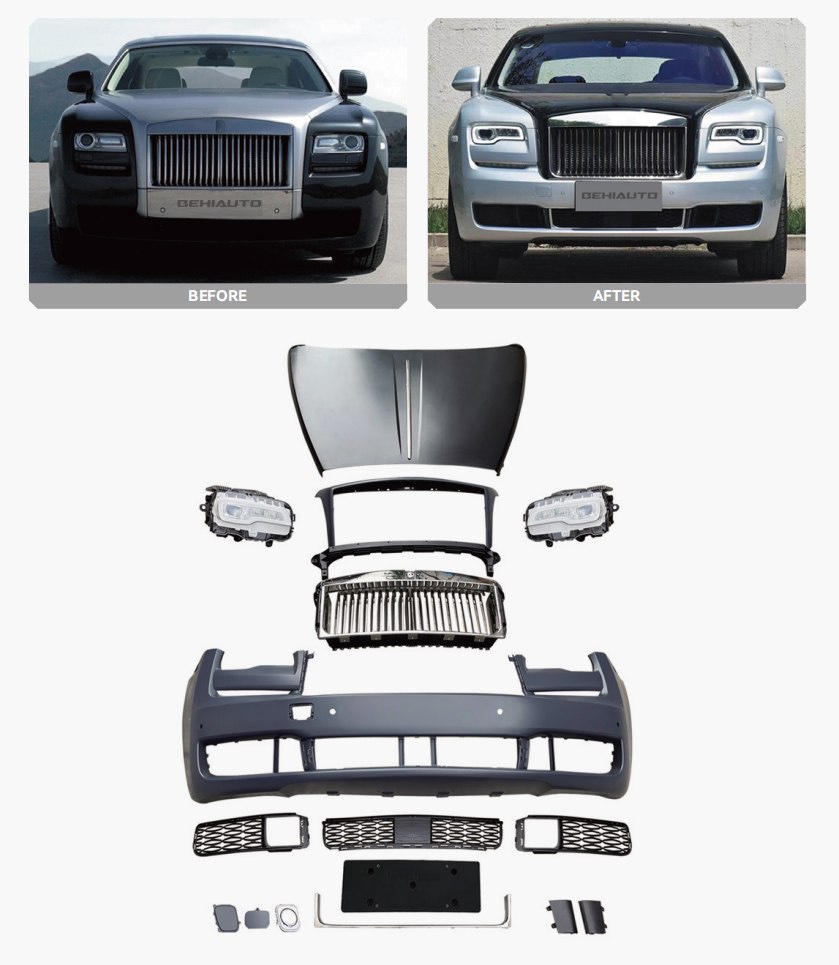 طقم بودي كيت متكامل مصمم خصيصًا لسيارة رولز رويس غوست الجيل الأول، يمنح السيارة تحديثًا فاخرًا إلى تصميم 2020 مع مظهر عصري وأناقة أصلية. يشمل الكبوت، الصدام الأمامي، الشبك، المصابيح الأمامية، الشبكات السفلية، القطع التجميلية وقواعد التثبيت، مع تصنيع دقيق لضمان تركيب مثالي وتشطيب عالي الجودة. مناسب لمشاريع التعديل الاحترافية والورش التي تبحث عن ترقية راقية تحافظ على هوية السيارة الفاخرة.
