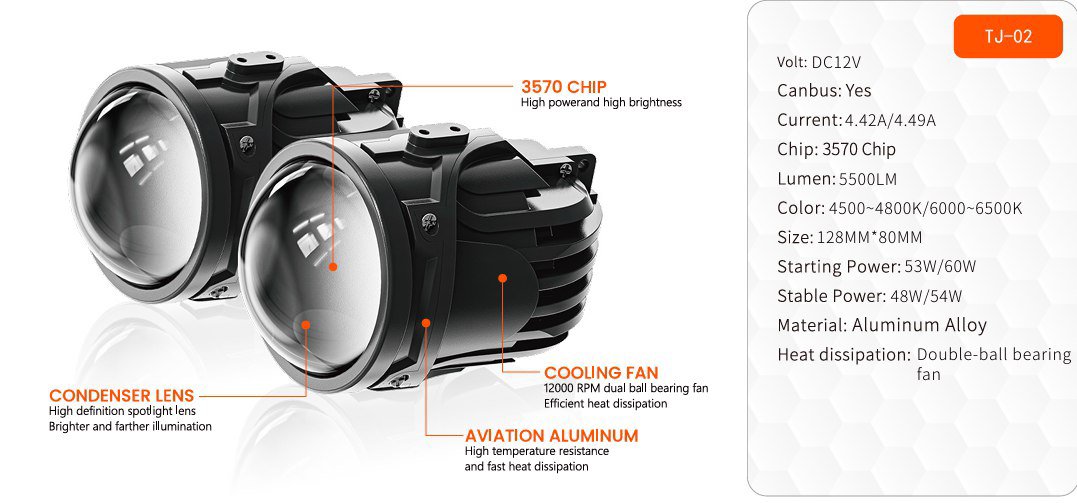 تعتمد العدسة على شريحة إضاءة 3570 عالية الكفاءة لتقديم سطوع يصل إلى 5500 لومن، مع خيارين من ألوان الإضاءة (4500–4800K أو 6000–6500K) لتناسب مختلف ظروف القيادة.