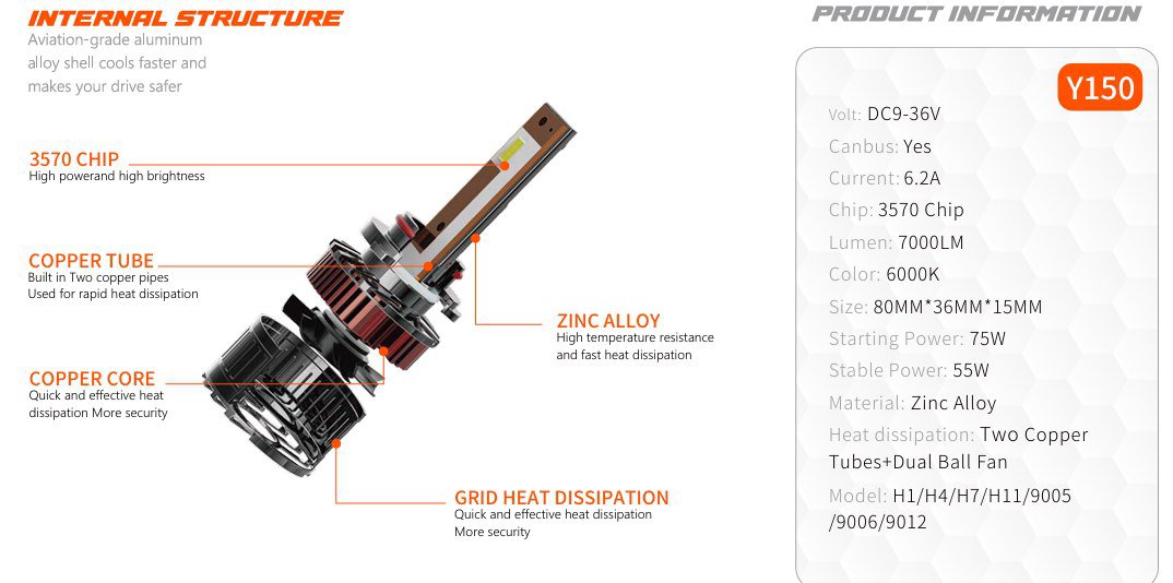 تعتمد اللمبة على شريحة إضاءة 3570 عالية الكفاءة لتقديم سطوع يصل إلى 7000 لومن بلون أبيض نقي بدرجة 6000K، مما يمنح الطريق أمامك وضوحاً أفضل ويساهم في قيادة أكثر أماناً.